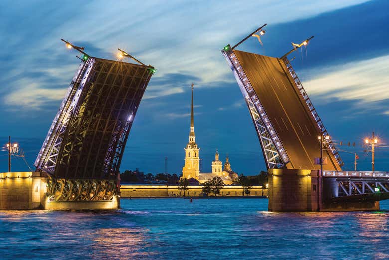 Começaremos o tour na cêntrica Praça do Palácio, junto à Coluna de Alexandre. Desse conhecido lugar e sob a beleza da cidade iluminada, nos dirigiremos às margens do rio Neva para contemplar as pontes levadiças de São Petersburgo pela noite.